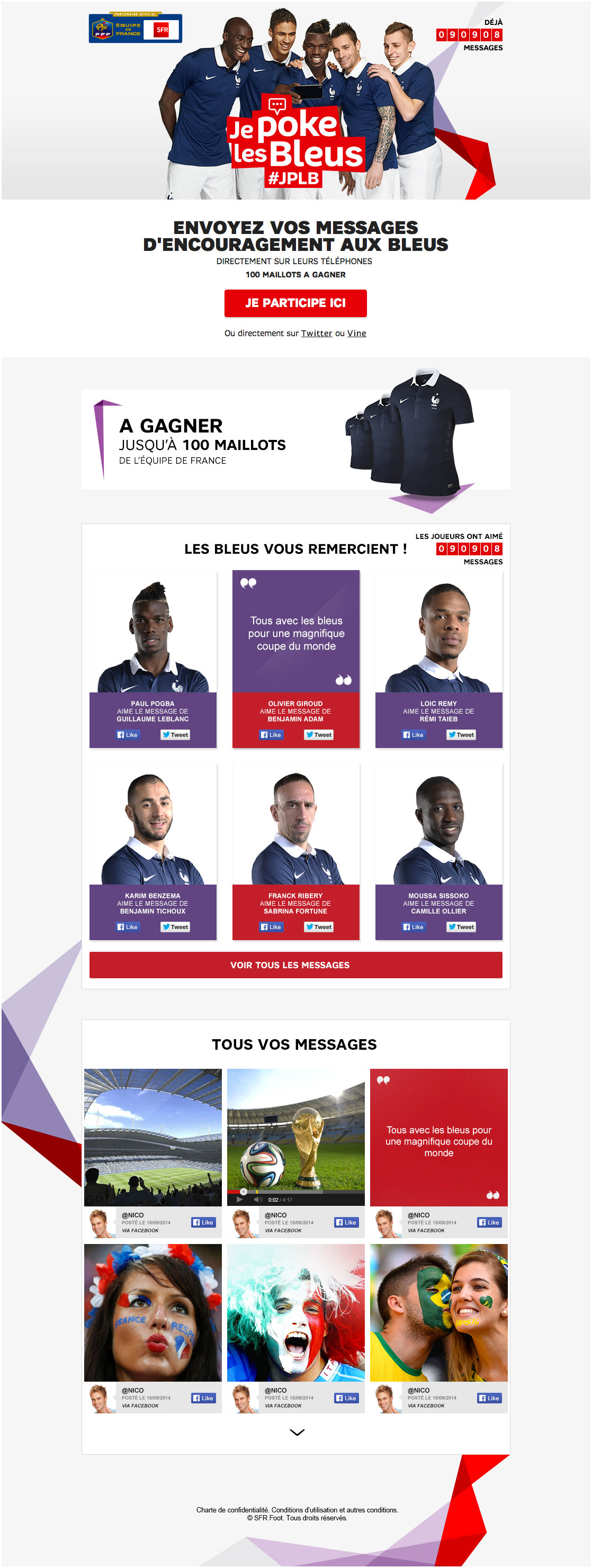 Conception de l’opération « Je Poke les Bleus » à l’occasion de la Coupe du Monde de Football 2014. Campagne déployée dans toute la France et à travers plusieurs canaux (social, web, espaces SFR et enseignes de grande distribution). Sur Facebook, Twitter ou Vine, les encouragements envoyés aux joueurs de l’Équipe de France avec le hashtag #JPLB sont directement transmis sur leur téléphone. Encore plus cool : certains tweets étaient diffusés sur le bord du terrain pendant les matchs de l’équipe.